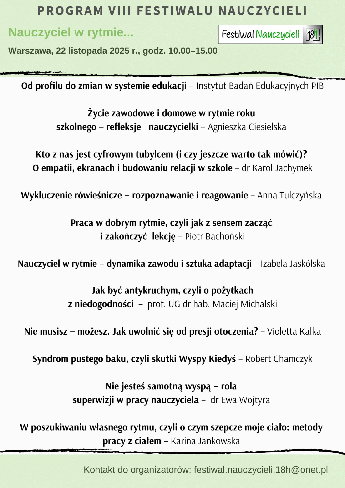 Program został opracowany na podstawie propozycji zgłaszanych przez nauczycieli uczestniczących w poprzednich Festiwalach Nauczycieli.